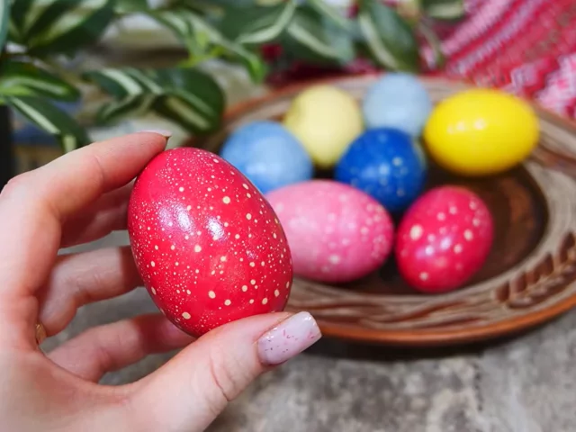 Фарбування триває буквально дві хвилини, але важливо, щоб розчин залишався гарячим — це впливає на насиченість кольору. Після цього яйця достатньо дістати і акуратно протерти паперовою серветкою.