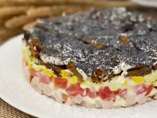Сверху щедро присыпаем маком — это не только про вкус, но и про стиль. Салат сразу выглядит как блюдо из Pinterest, а не «на скорую руку».